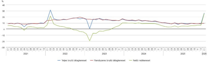 A bruttó átlagkeresetek és a nettó reálkeresetek alakulása, 2021-2026. január között