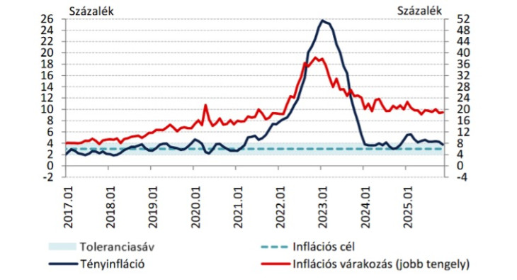 Az adatokból több dolog is kiolvasható. Maga az infláció (vagyis a KSH által mért fogyasztóiár-index) már 2021 elejétől magasabb az MNB megengedően magas inflációscél-sávjánál. A 2023-as nagy pénzromlási csúcsot követő konszolidációs folyamatban a folyamatos dezinfláció helyett inkább a beragadás jelei látszanak. Aztán nagy a különbség az inflációs várakozások mértékét illetően: míg 2017-2018-ban még el lehetett mondani, hogy a „lakossági várakozások mérsékelt szinten horgonyozottak”, amennyiben a hivatalosan mért 2-3 százalékos inflációval egy időben az áremelkedési várakozások 4-5 százalékos értéket mutattak, vagyis hazai viszonyok között szerények voltak, addig most