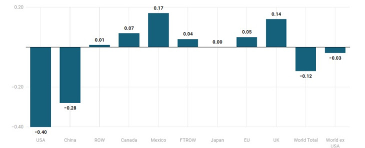 Ugyancsak a pozitív tartományban van az Egyesült Államon és Kínán kívüli világ (angolul ROW: rest of the world) minimális mértékben, továbbá mérhető nagyságrendben nyer Kanada és Mexikó, amelyeknél valami még megmaradt a térségi vámunióból (USMCA). Valamennyit nyer az az országcsoport, amelynek szabadkereskedelmi megállapodása van Amerikával (FTROW). Japán pozíciója nulla körüli.