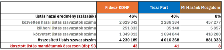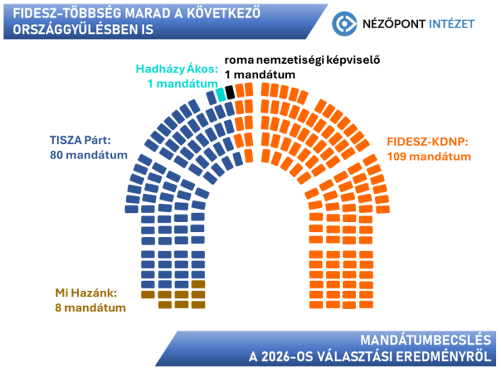 A Nézőpont Intézet mandátumbecslési projektjének előrejelzése arra tesz kísérletet, hogy a 106 választókörzet legvalószínűbb győztese mellett megbecsülje a 93 listás mandátum eloszlását is. A 106 választókerület legvalószínűbb győzteseit a hét folyamán már publikálta a Nézőpont Intézet: 66-ban várható Fidesz-győzelem, 39-ben Tisza-győzelem és 1 választókerületben Tisza-barát, de független jelölt győzelme esélyes.