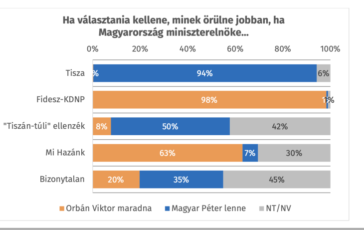 A bizonytalanok körében Magyar Péter népszerűbb, mint Orbán Viktor. A bizonytalanok 35 százaléka Magyart szeretné látni a miniszterelnöki poszton, míg Orbánt csak 20 százalékuk preferálná, vagyis ebben a közegben Magyar tartaléka több, mint másfélszerese Orbánénak. A bizonytalanok kevesebb, mint fele volt döntésképtelen, ebből is látszik, mennyire nehéz kikerülni a politikai hatásokat az intenzív kampányban.