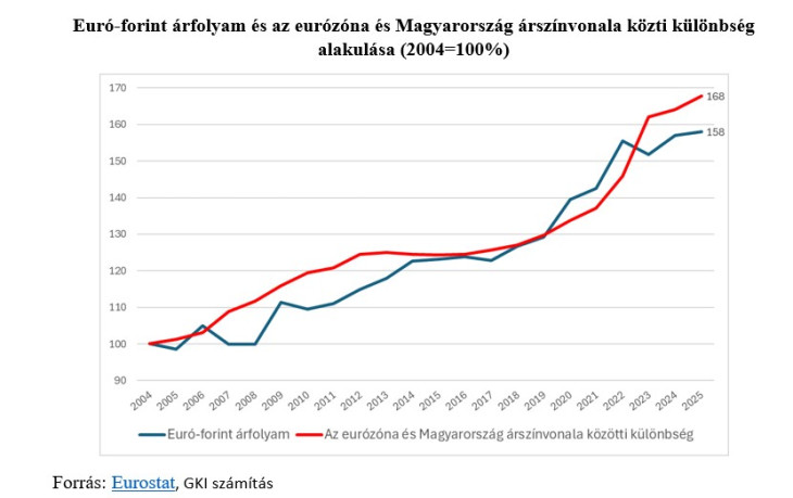 A 2004-es uniós csatlakozás óta 2024-ig a forint euróval szembeni árfolyamát alapvetően az eurózóna és Magyarország közötti inflációs különbség mozgatta. Ez a gyakorlatban azt eredményezte, hogy a hazai fizetőeszköz olyan mértékben értékelődött le, amennyivel a magyarországi áremelkedés üteme meghaladta az euróövezet áremelkedését. 2004 óta 68 százalékkal növekedtek jobban az árak nálunk, mint az eurózónában, miközben a forint 58 százalékkal értékelődött le az euróhoz képest. Ugyanakkor 2023-tól a két mutató elkezdett szétválni, azaz az eurózónához képesti magasabb hazai infláció egyre kevésbé tükröződött az árfolyam változásában (vagyis a forint relatíve felértékelődött). 2025-ben 2,3 százalékpont volt az eurózóna és Magyarország adatai közti inflációs különbség, míg az euró éves átlagos árfolyama 395,3-ról csupán 397,8-ra emelkedett, amely mindössze 0,6%-os növekedés. 2025-ben 10 százalékpont lett a különbség a két mutató között.