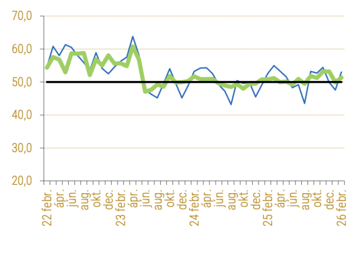 A Beszerzési Menedzser Index (BMI) szezonálisan kiigazított februári értéke: 51,3. Ez a korábbi február havi értékekkel összevetve alacsonyabb, mint a hosszú távú e havi átlag (52,6), de megegyezik az előző három év e havi értékeinek átlagátval (51,3).