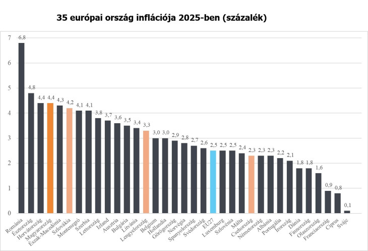 A visegrádi országok között Magyarországon volt a legmagasabb a pénzromlás üteme, amelyet szorosan követ a hasonló makrogazdasági kihívásokkal küzdő Szlovákia, míg Lengyelország az európai mezőny közepén helyezkedik el. Csehország az egyetlen olyan szereplő a négyesből, amelynek sikerült az uniós átlag alá szorítania az inflációját. A 2025-ben az euróövezet inflációs rátája 2,1 százalék volt, 2026-ra 1,9 százalékot prognosztizál az Európai Központi Bank. Mindez azt jelenti, hogy az eurózóna átlagos adatai megfelelnek az EKB inflációs célkitűzésének, bár számos kelet-európai tagállamban, így a már említett Szlovákia és Horvátország mellett a balti országokban is a 2 százalékos célnál jóval magasabb az infláció.