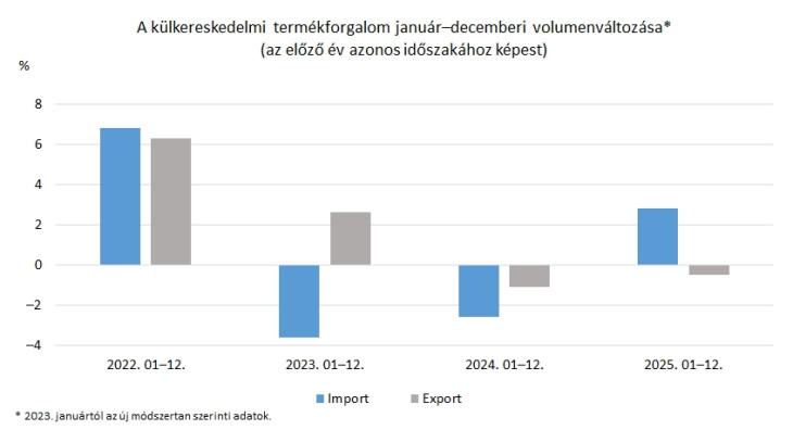 2025. decemberben az egy évvel korábbi időszakhoz képest euróban kifejezve az export értéke 6,0 százalékkal, az importé 6,5 százalékkal nőtt. Naptárhatással kiigazítva a kivitel volumene 0,8 százalékkal, a behozatalé 5,0 százalékkal bővült.
