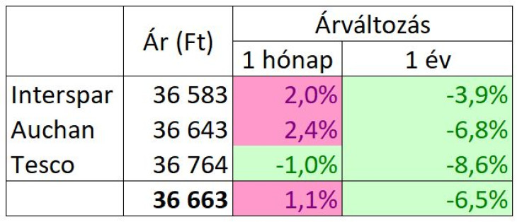 A három vizsgált áruház közül kettő lett drágább februárhoz képest, egy pedig olcsóbb; tavaly márciushoz képest viszont mindannyian engedtek az árakból. A három áruház között elképesztően kicsi lett a különbség: még az aktuálisan legdrágább és legolcsóbb között is kevesebb mint 200 forint az eltérés, nem éri el a fél százalékot sem.