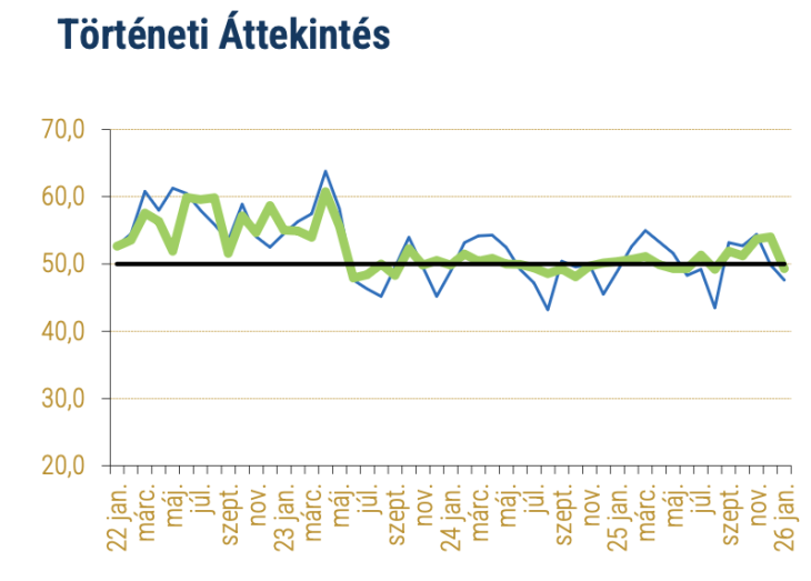 Januárban a válaszadók az előző hónaphoz képest a feldolgozóipar zsugorodásáról számoltak be. A 2025. év nyári hónapjaiban többnyire a feldolgozóipar lassulását figyelhettük meg, az év utolsó harmadában a trend megfordult. Az új évben a BMI index csökkent, ezúttal 50,0 alatti értéken áll. Az egyedi indexek nagyobb részben csökkentek.