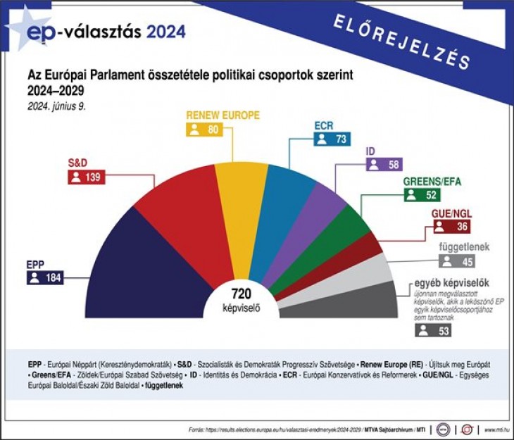 A vasárnapi választásokon a jobbközép Európai Néppárt (EPP) szerezte meg az első helyet 184 mandátummal, így a szocialisták és demokraták (S&D) a második helyen állnak 139-cel, a liberális Megújulás frakció pedig 80 mandátummal - írja az Euractiv