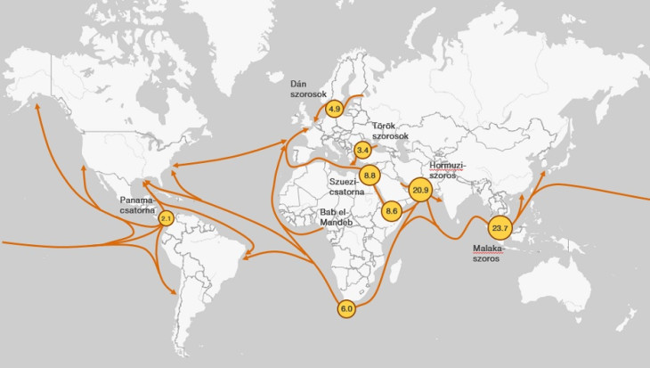 A legjelentősebb tengerinyersolaj- és olajtermékszállítási útvonalak és szorosok (millió hordó/nap)