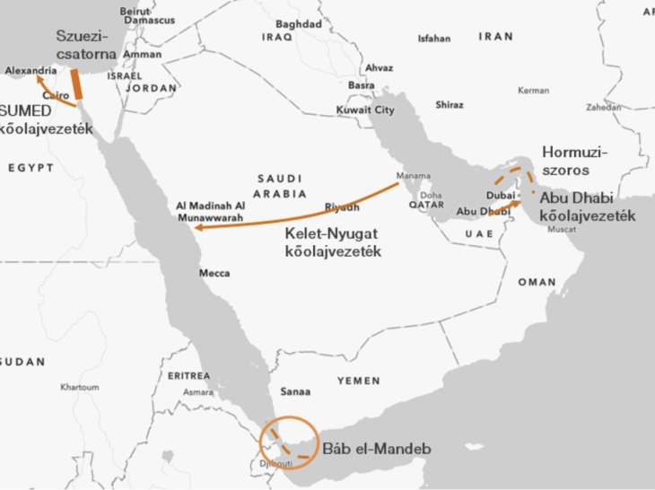 Forrás: EIA: Country Analysis Brief: World Oil Transit Chokepoints (2024), ArcGIS Online, Concorde
