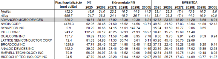Hasonló a tendencia az EV/EBITDA esetében is, bár itt a hosszútávú előrejelzések kissé hiányosak. A dinamikusabb növekedés viszont közel sem jelenti a piacon kialakult hierarchia felborulását. Árbevételre levetítve az Nvidiához mérve az 1:12-es arányszám egy számjegyűvé válhat ismét. Ebbe az irányba mutatnak a Meta gigaberuházásokon keresztüli diverzifikációs törekvései is. Ugyanennél a versenytársi csoportnál egyébként az AMD kifejezetten jól pozícionált, a regressziós egyenest használva 36 százalékos felértékelődési potenciállal bír.