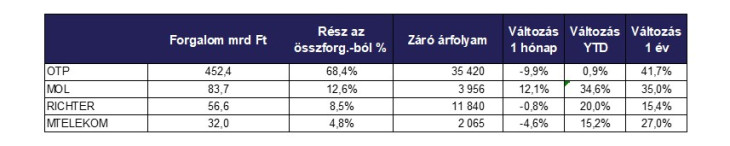 A blue chipek közül továbbra is az OTP Bank papírjaival zajlott a legnagyobb értékű kereskedés, 452,4 milliárd forinttal, ami a teljes részvénypiaci forgalom 68,4 százalékát adta. A második helyen a MOL végzett 83,7 milliárd forinttal, az olajtársaságot követte a Richter Gedeon 56,6 milliárd forintos értékkel. A közepes kapitalizációjú kibocsátók közül a Shopper Park Plus érte el a legnagyobb, mintegy 8,8 százalékos árfolyamnövekedést.