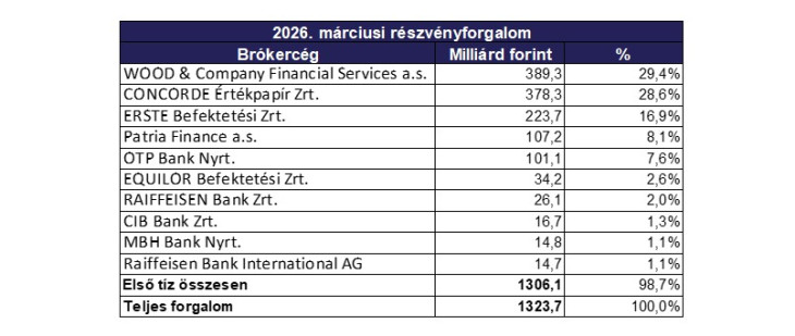 A részvénypiac összforgalma számottevően emelkedett februárhoz képest, napi átlagban 30,08 milliárd forintot tett ki. A három legnagyobb forgalmú részvény, az OTP Bank, a MOL és a Richter Gedeon sorrendben 452,4, 83,7 és 56,6 milliárd forintos értéket ért el a havi kereskedés során. A vezető brókercégeknél ismét szoros verseny alakult ki a WOOD & Company és a Concorde között, végül a WOOD & Company végzett az első helyen, míg a harmadik helyen az ERSTE szerepelt – áll a BÉT közleményében.