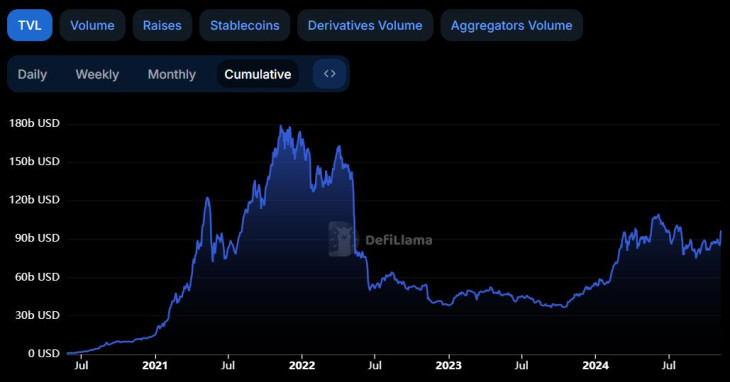 Hozzátehetjük, hogy a lekötött tőke alapján azért a DeFi-szektor eddig sem volt éppen halott, októberben is mintegy 85-88 milliárd dollárt tartottak a befektetők ilyen konstrukciókban, amint a Defillama ábráján is látható: