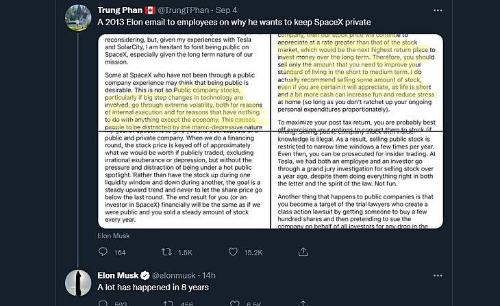 ElonMusk a Twitteren egy hónapokkal ezelőtti üzenetre, saját levelének felemlegetésére válaszolt, amely arról szólt, hogy szerinte miért nem vezették be tőzsdére a SpaceX űrvállalkozást. Az idézett levél is jó régi, most annyit fűzött hozzá, hogy nyolc év alatt sok minden történt.