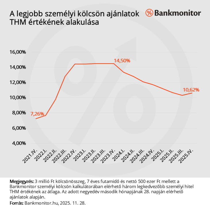 2021. végén a Bankmonitor személyi hitel kalkulátorában szereplő 3 legkedvezőbb ajánlat átlagos THM értéke 7,26 százalék volt. 2023 végén volt a mélypont, akkor ugyanezen kölcsönre a legkedvezőbb ajánlatok átlagos THM értéke már 14,50 százalék volt. Jelenleg egy hasonló hitelt már 10,62 százalékos THM érték mellett is fel lehet venni.
