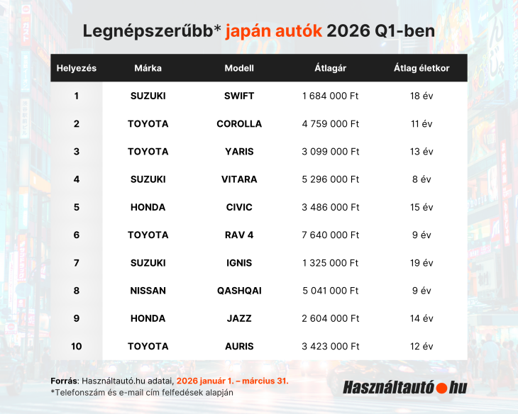 „A japán autók népszerűségének fő oka Magyarországon a megbízhatóság, a kedvező fenntartási költség és a jó értéktartás. A hazai vásárlók többsége olyan modellt keres, amely hosszú távon is kiszámítható választás, ritkábban hibásodik meg, és idősebb korban is könnyen eladható. A Toyota, Suzuki és Honda márkák iránt régóta erős a bizalom: ebben szerepet játszik a Suzuki hazai jelenléte, a Toyota ismert megbízhatósága, valamint a Honda tartóssága is. Emellett a Swift, Yaris vagy Corolla méretben és fogyasztásban is jól illeszkedik a magyar autósok mindennapi igényeihez” – mondta Koralewsky Márk, a Használtautó.hu vezetője.
