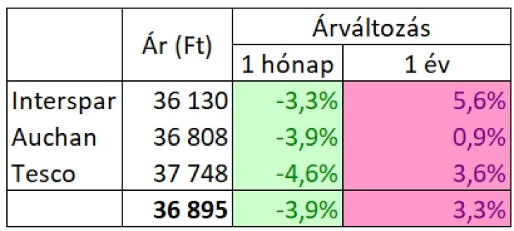 A változás ezúttal sem egy kiugró értéknek köszönhető, az árak nagyon hasonlóan változtak a három egymástól függetlenül működő és árazó áruházláncnál. Mindhárom szereplőnél csökkent az előző hónaphoz képest a végösszeg (3,3 és 3,9 százalék közötti mértékben), az éves áremelkedés mértéke pedig szintén nem kiugróan széles sávban, 0,9 és 5,6 százalék között szóródott. A legnagyobb havi árcsökkenést ezúttal a Tesconál mértük, a legkisebb éves áremelést az Auchanban, a legalacsonyabb kosárértéket pedig az Intersparban.